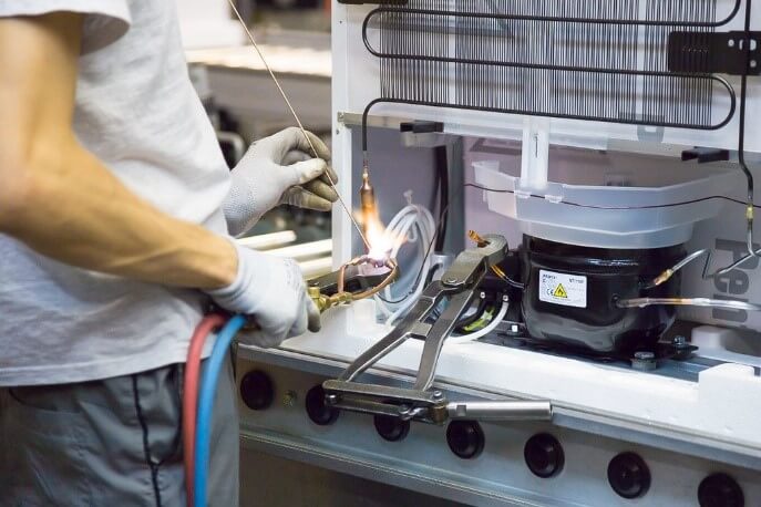- Сильно шумит холодильник. Причиной шума является нарушенное положение холодильника, стоит проверить и отрегулировать наклон ножек. Если это не помогает, потребуется рука мастера, чтобы провести диагностику мотора, запчасти деформируются из-за перепадов температур и необходима замена расходных частей. Цены от 5000 тенге.